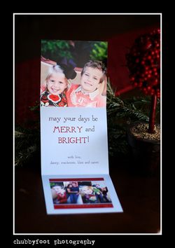 we're off for a whirl-wind 10 day family holiday, so I thought I'd post one last time before the new year. It has been an incredible year in so many ways. I finished my FIFTH year in business and what a blessing it has been. I still absolutely love what I do and am so grateful for all the neat people that come my way each year! So, it's MY TURN to wish YOU a wonderful christmas! I wish I could send everyone a christmas/thank you card, but this virtual one will have to do! I took pictures of my card and thought I'd share it here on the blog. It's gotten a great response and I'll be posting places where you can get the same for next year. Right now, there's not a lot of regular commercial sites that create these (i actaully designed it myself and had it printed at a professional printing press), but I bet we'll be seeing more crop up in the next couple of years. And I have a few clients that have started businesses and will be offering these as well. So I promise more to come on that...